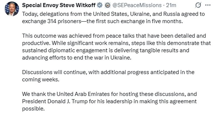 "Цього результату було досягнуто під час детальних і продуктивних мирних переговорів. Хоча попереду ще багато роботи, такі кроки демонструють, що постійна дипломатична взаємодія приносить відчутні результати і просуває зусилля з припинення війни в Україні", — написав він.